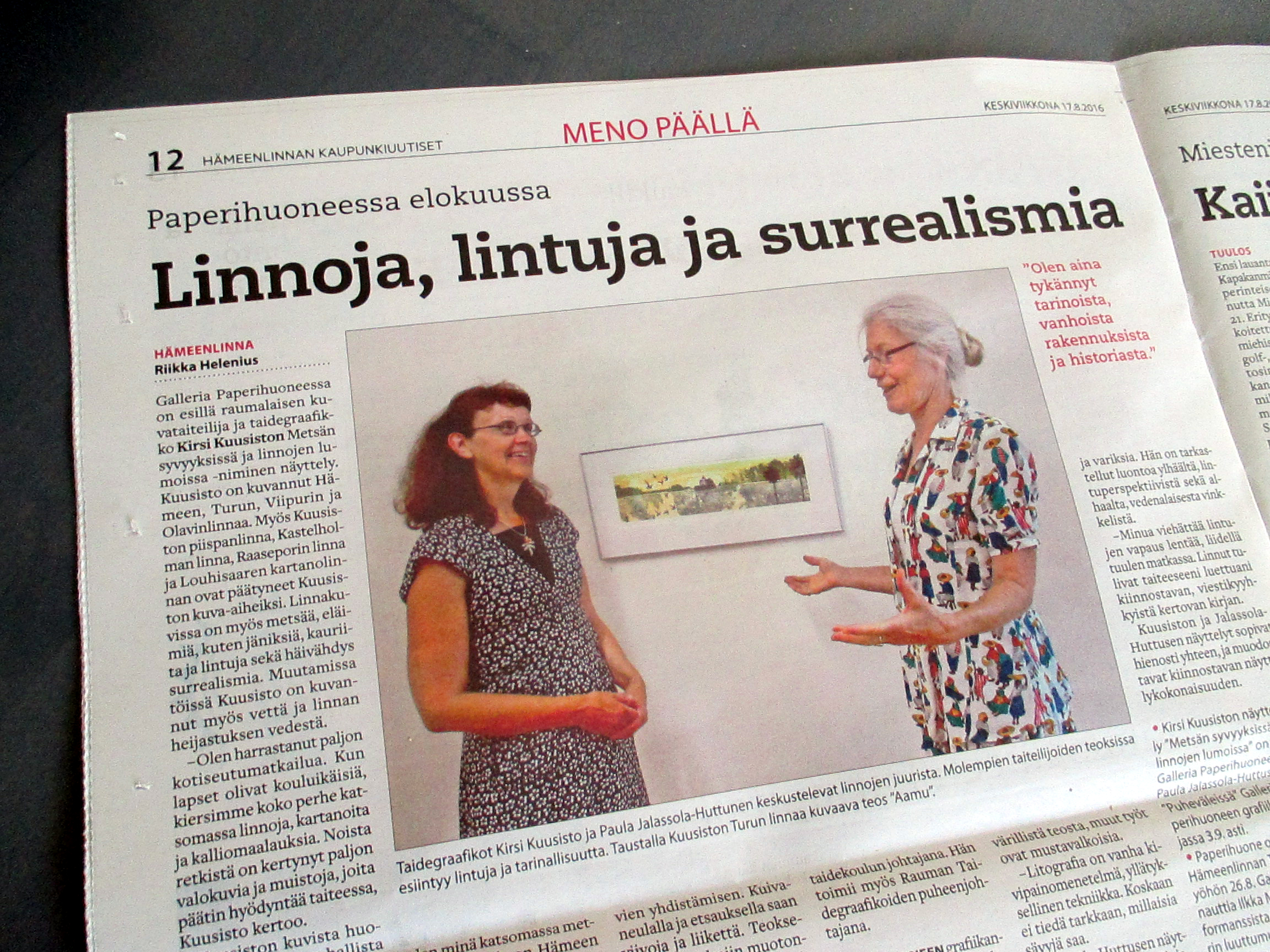 Hämeenlinnan kaupunkiuutiset julkaisi ke 17.8.2016 näyttävän jutun Galleria Paperihuoneen elokuun näyttelyistä. Kuvassa taidegraafikot Kirsi Kuusisto ja Paula Jalassola-Hutunen keskustelevat linnojen juurista. Näyttelyt ovat avoinna 3.9.2016 asti.