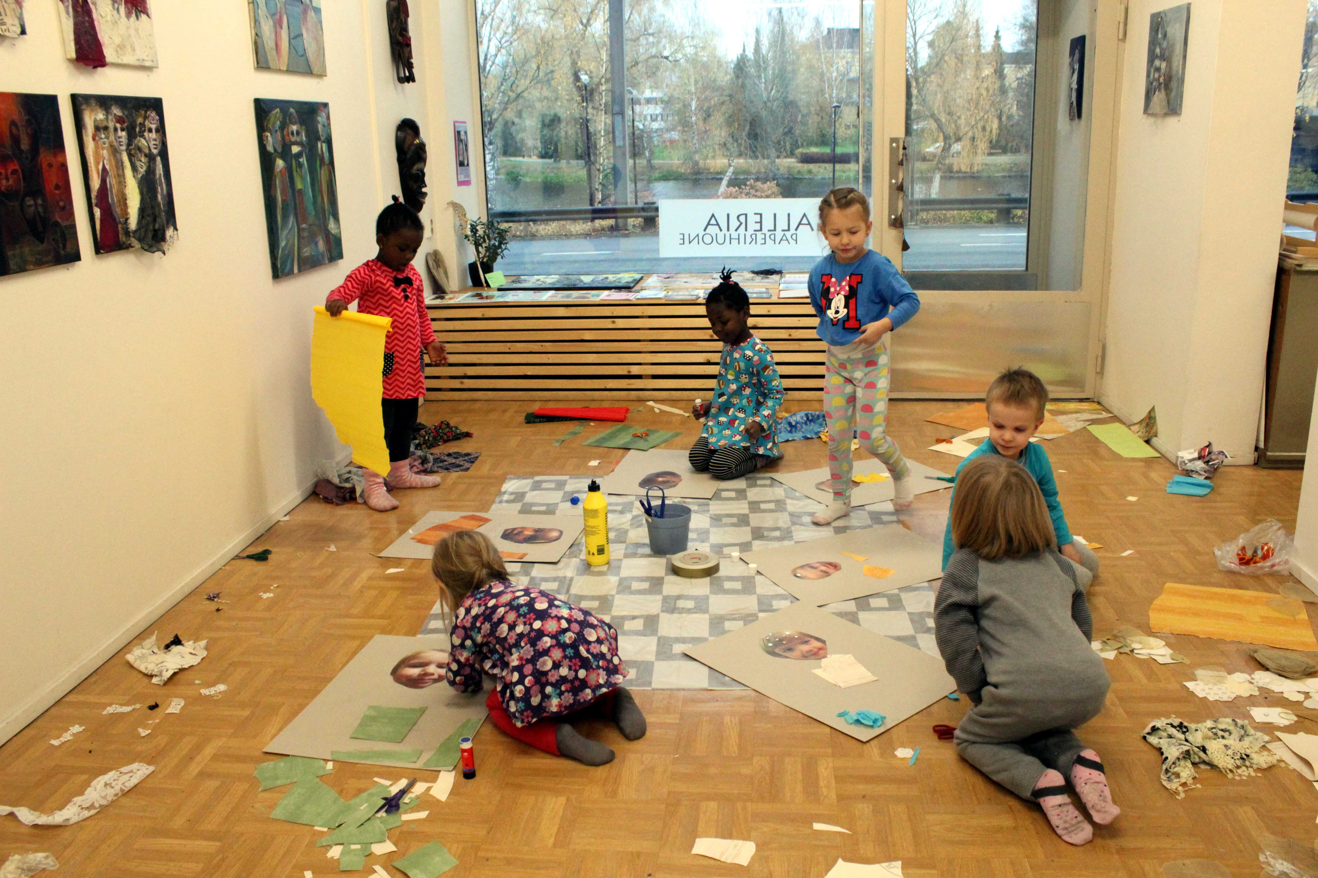 Lapsilla oli hauskaa, kun he levittäytyivät gallerian lattialle. Jokaiselle liimattiin oma kasvokuva pahvialustalle.