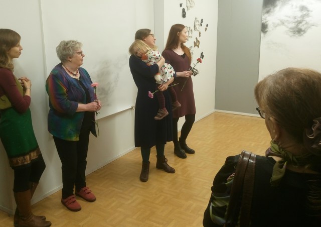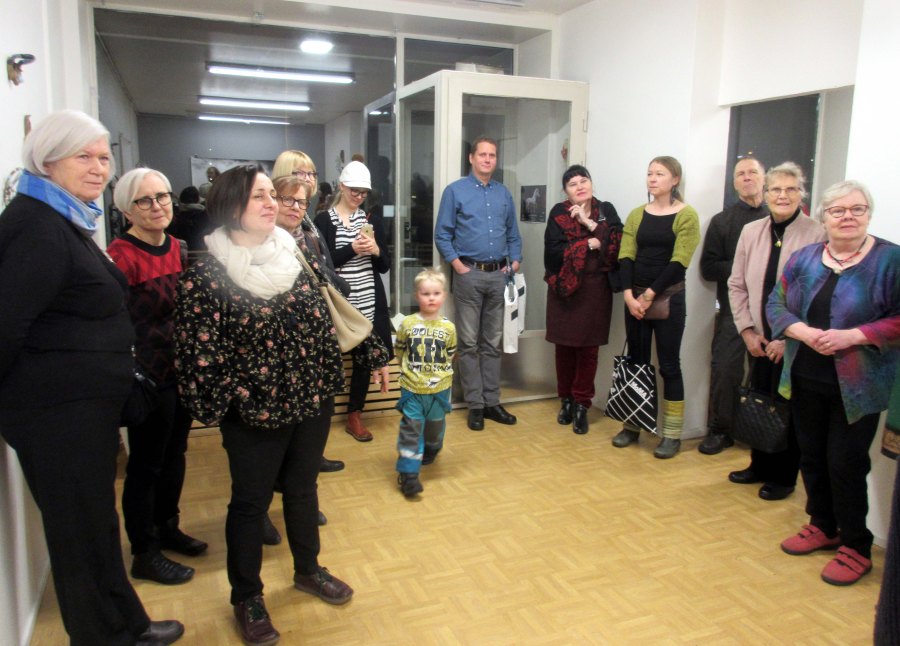 Joulukuun räntäsade ei näyttelyvieraita pelottanut. Ulla Niskanen toivotti taiteilijat ja heidän vieraansa lämpimästi tervetulleiksi.