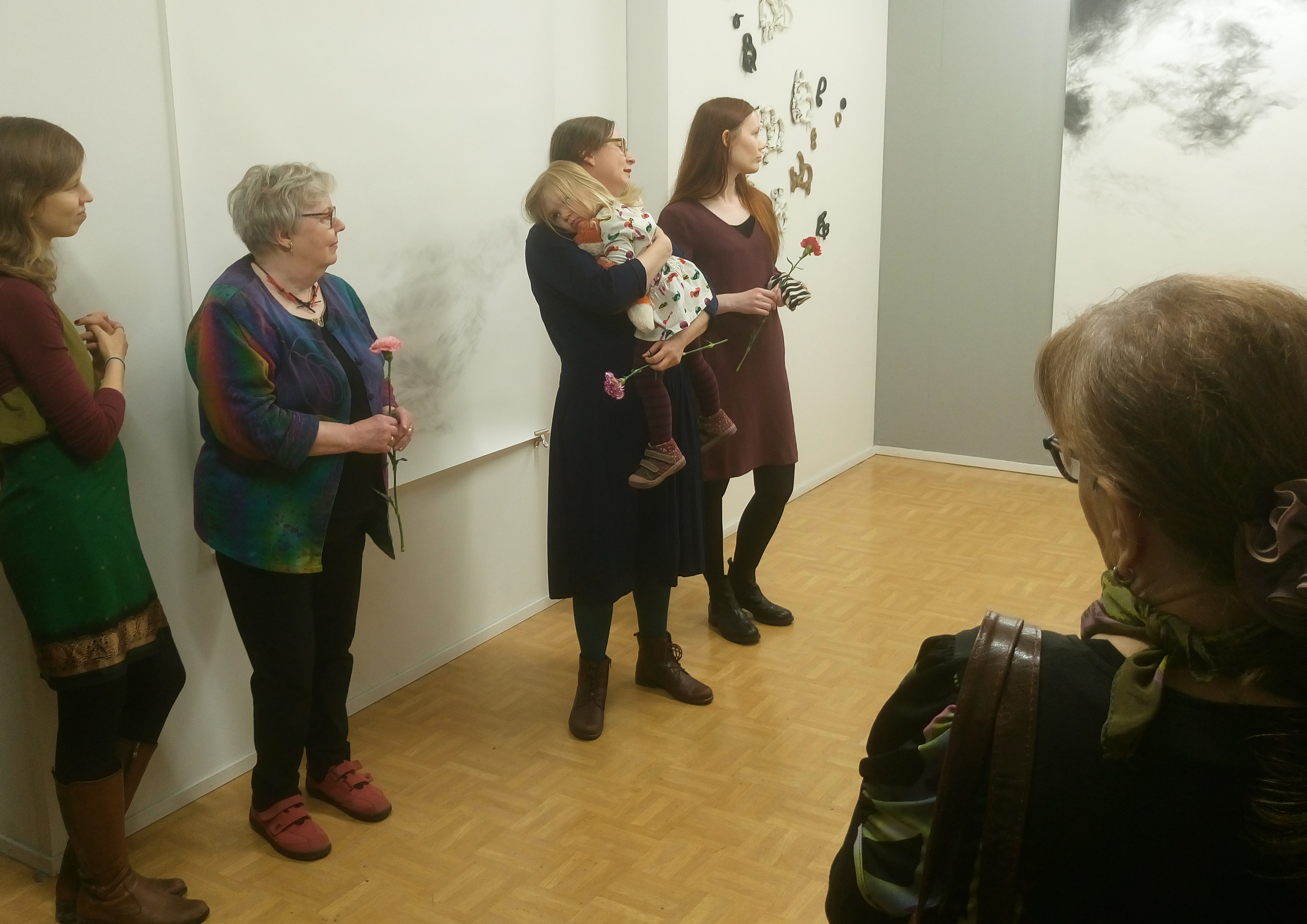 Piia ja Elina kertoivat avajaisvieraille teostensa taustoista. Innoituksen lähteitä ovat olleet katutaide ja japanilainen sommittelu, jossa tyhjällä tilalla on merkitys. Grafiikanpajan taiteilija Annamaija Bergman on vedostanut enkeliaiheita itse tekemälleen paperille.