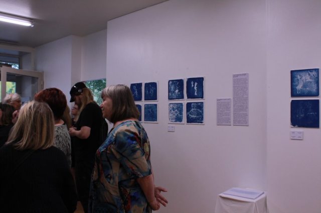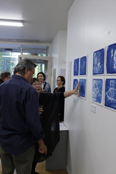 Pirkko kertoi avajaisvieraille teosten taustatarinaa ja tietoja.