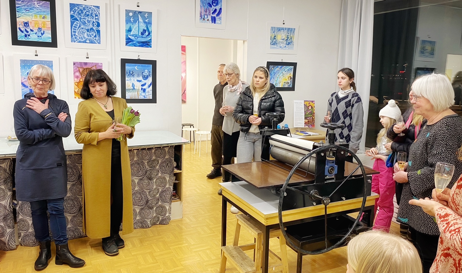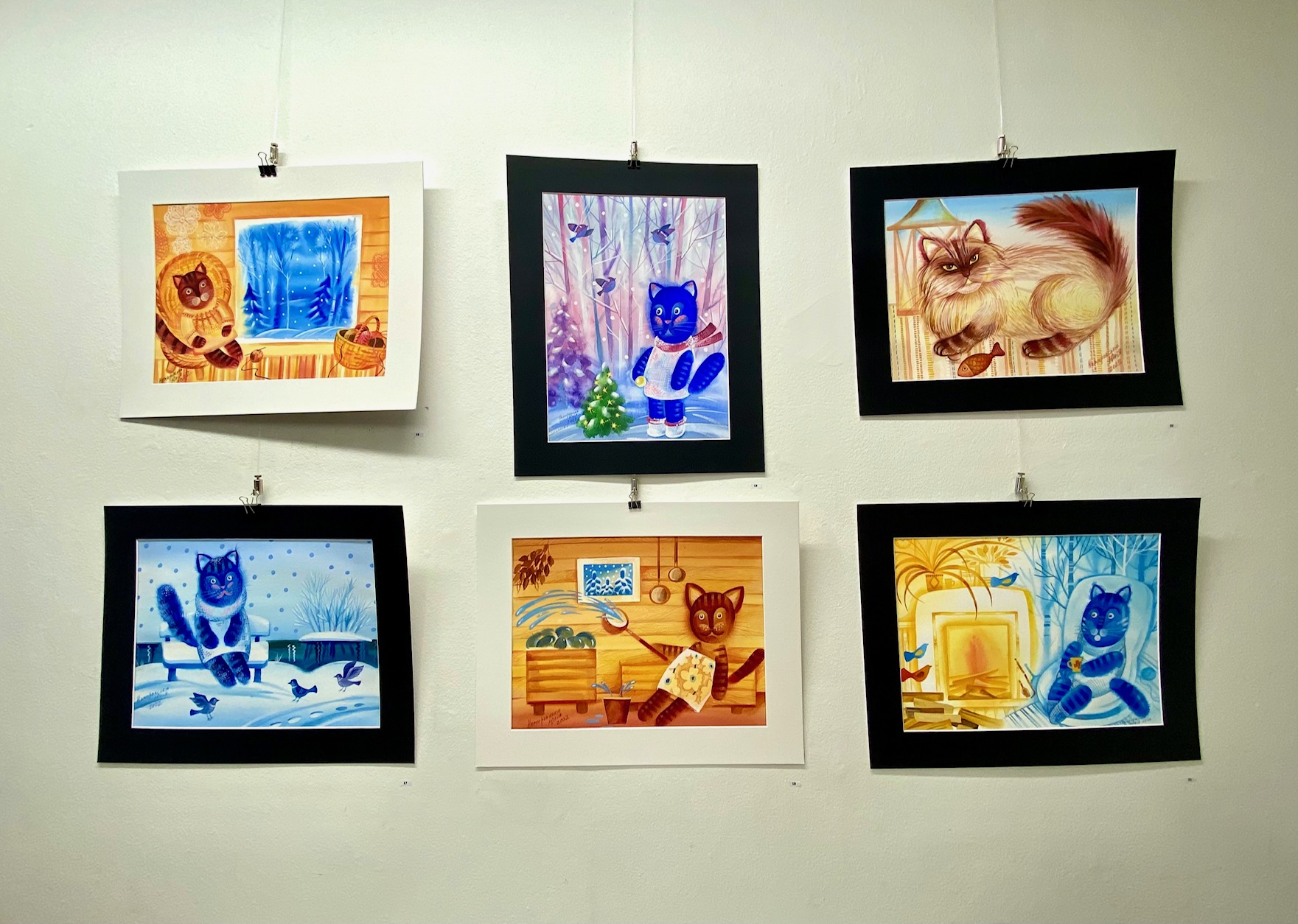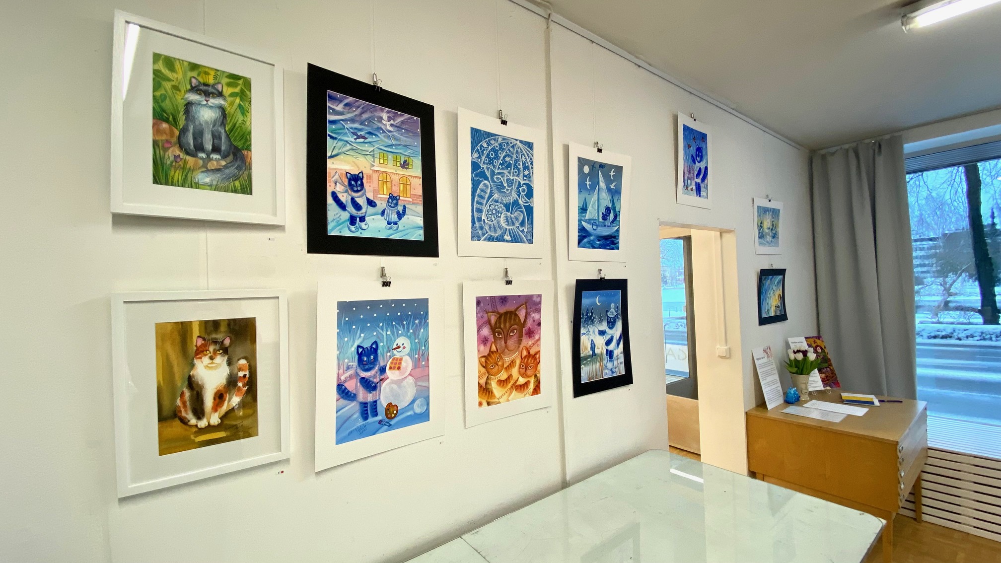 Grafiikanpajan puolella ukrainalaisen Yuliia Nemyrovskajan Mielenkiintoisia tarinoita satukissojen elämästä -näyttely.