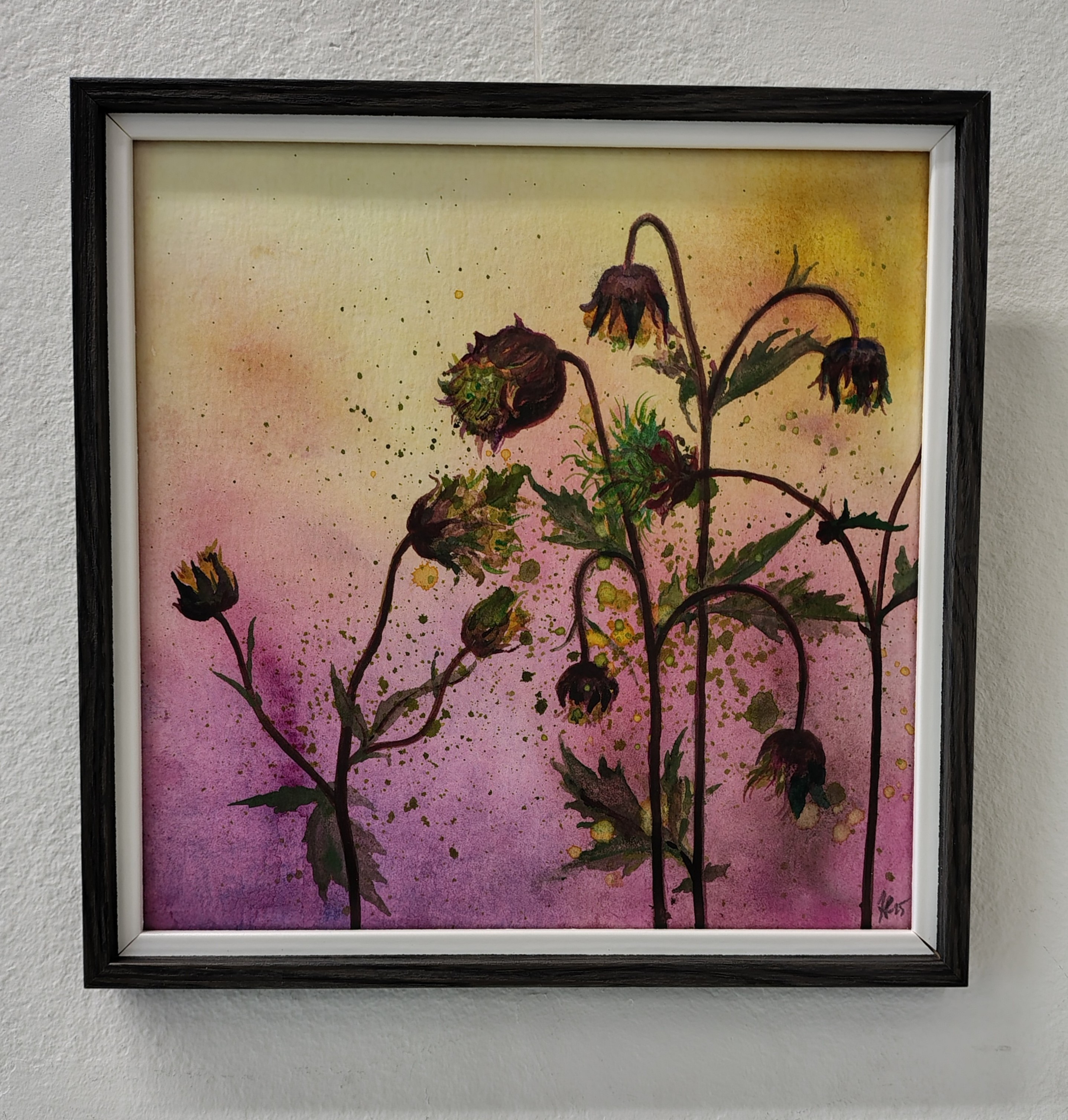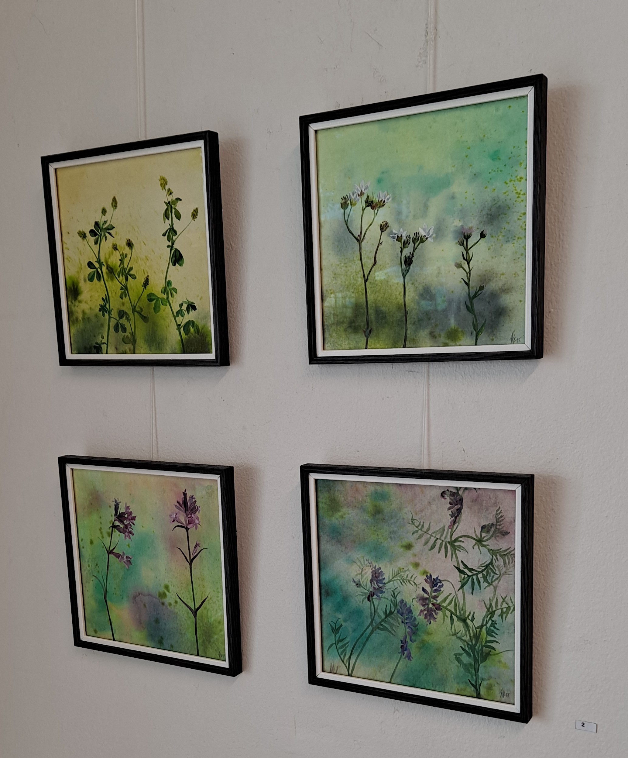 Yöstä siirrymme aamuun ja Kukka Pitkäsen herkkiin puupiirroksiin ja akvarelleihin. Grafiikanpajan seinillä on kuvia kukista, Midsommar magi: seitsemän akvarellin sarja siitä, mitä näemme niityllä jos vain maltamme pysähtyä. Akvarelleista löytyy tuttuja kukkia, hiirenvirnaa, tervakukkia ja muita niittyjen asukkaita. Kaikissa kuvissa on todella aamuinen tunnelma, valo siivilöityy ruohojen ja kukkien läpi, aurinkoa ei näy mutta sen voi aistia, linnut laulavat.