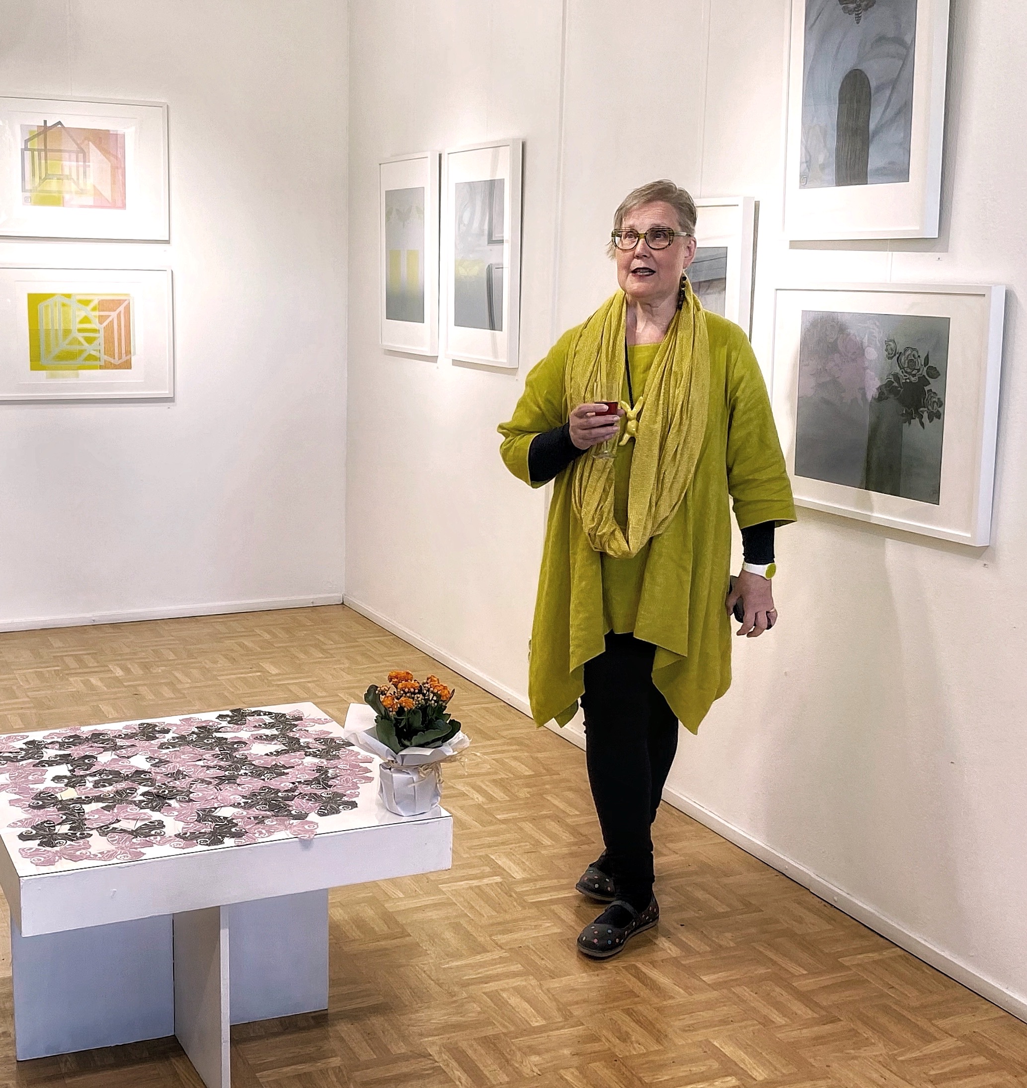 Jaana Tuomistolla on kulkenut teoksissaan mukana vuosikymmenet perhosteema, minkä yksityiskohdan voi poimia esillä olevista teoksista. Myös irrallisia perhosvedoksia on myynnissä (kuvien pöydällä nähtävissä).