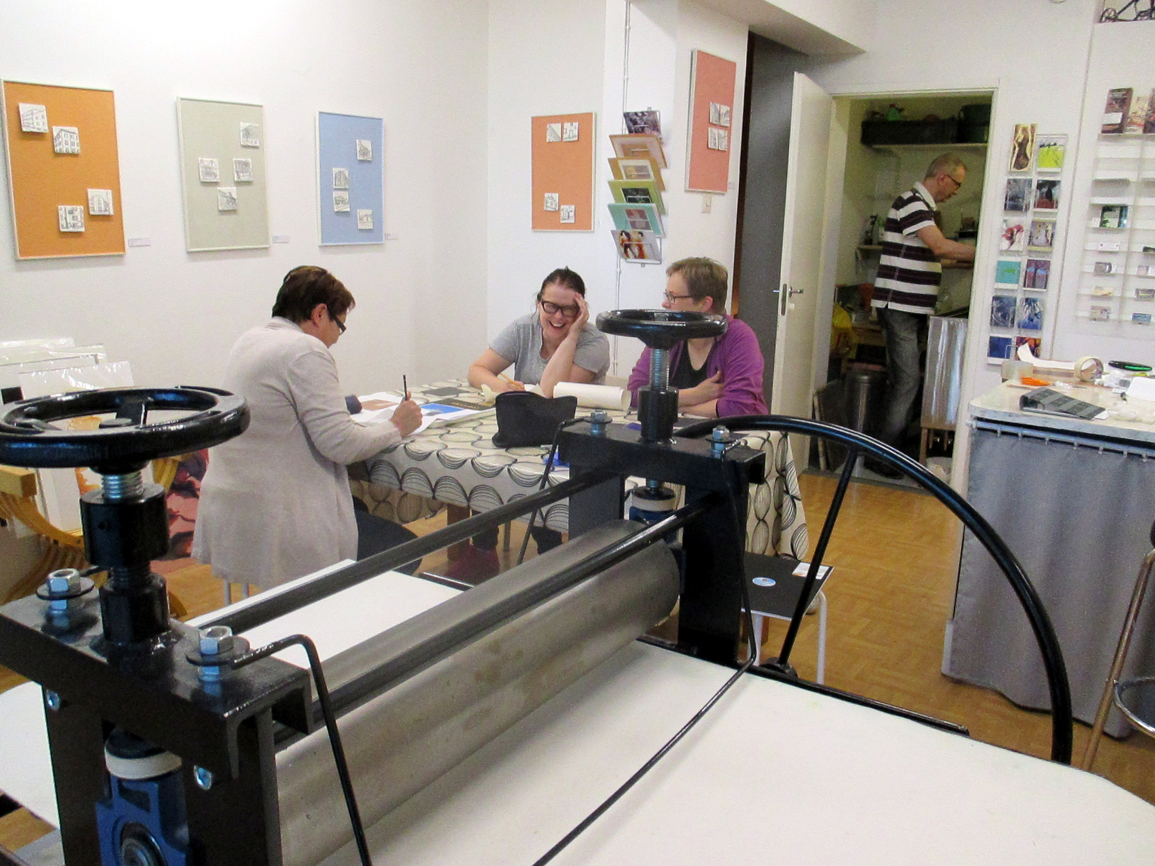 Puheenjohtajamme Petra Saraste opettaa sekä vasta-alkajia että meitä vähän kokeneempiakin grafiikanpajallamme Arvi Karistonkadulla. Olimme kaikki iloisia, että tarpeeksi osanottajia löytyi.
