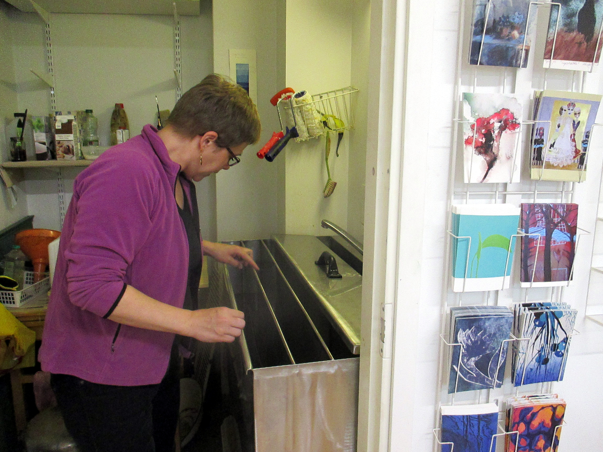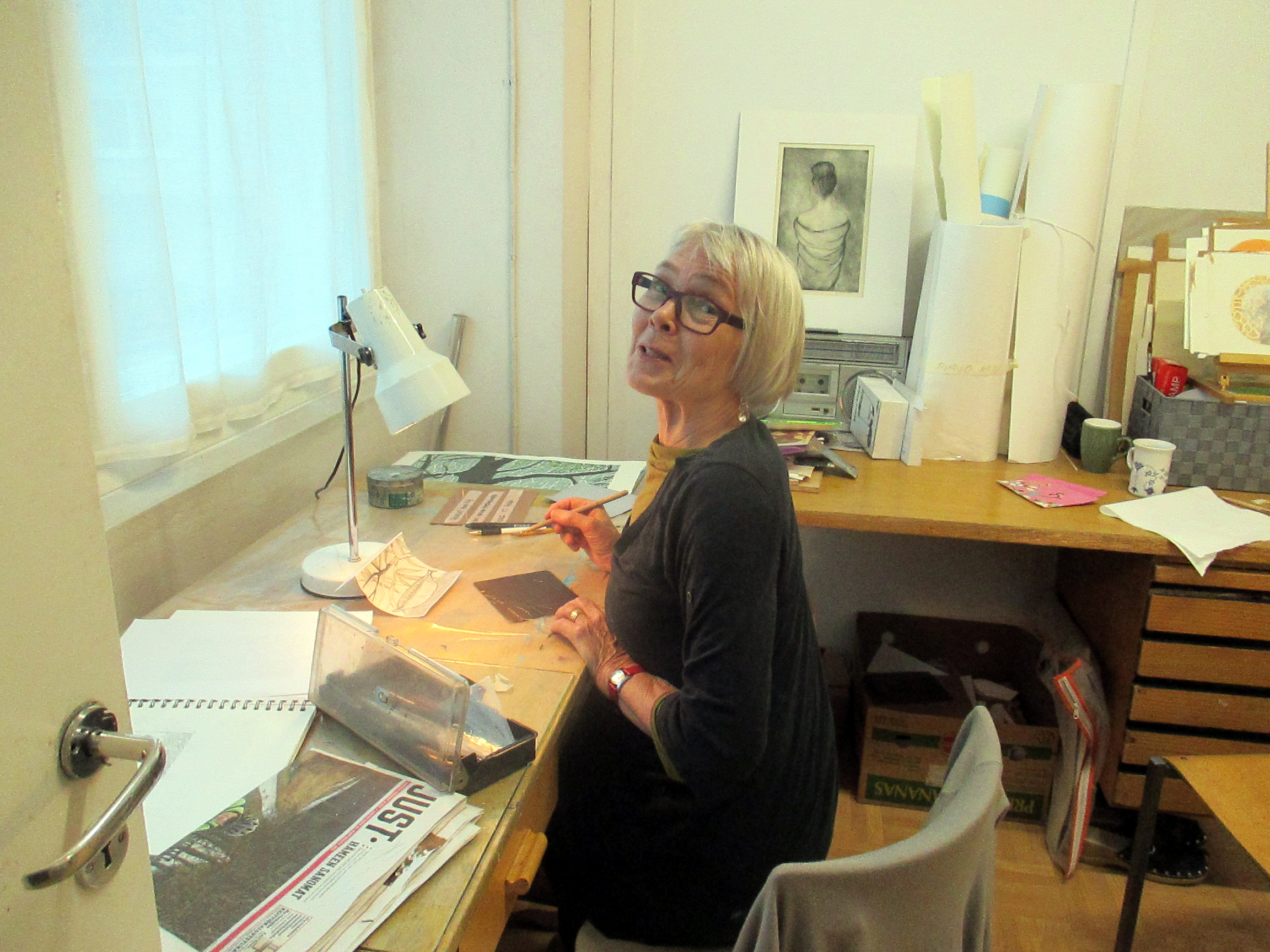 Grafiikanpajan taiteilija on Paula Jalassola-Huttunen. Hän ripusti yhdessä Kukan kanssa pajan puolelle lintuaiheisia litografioita.