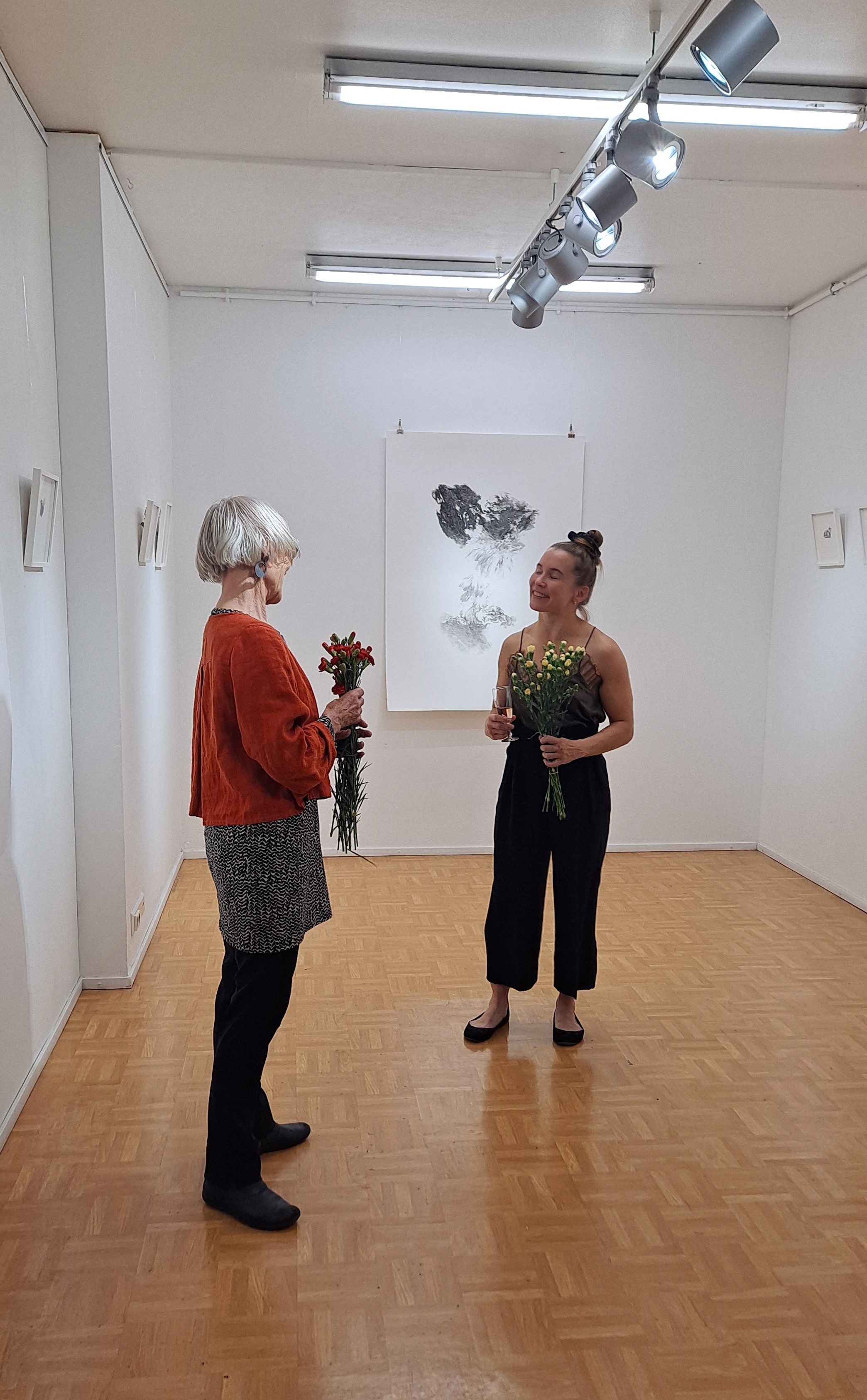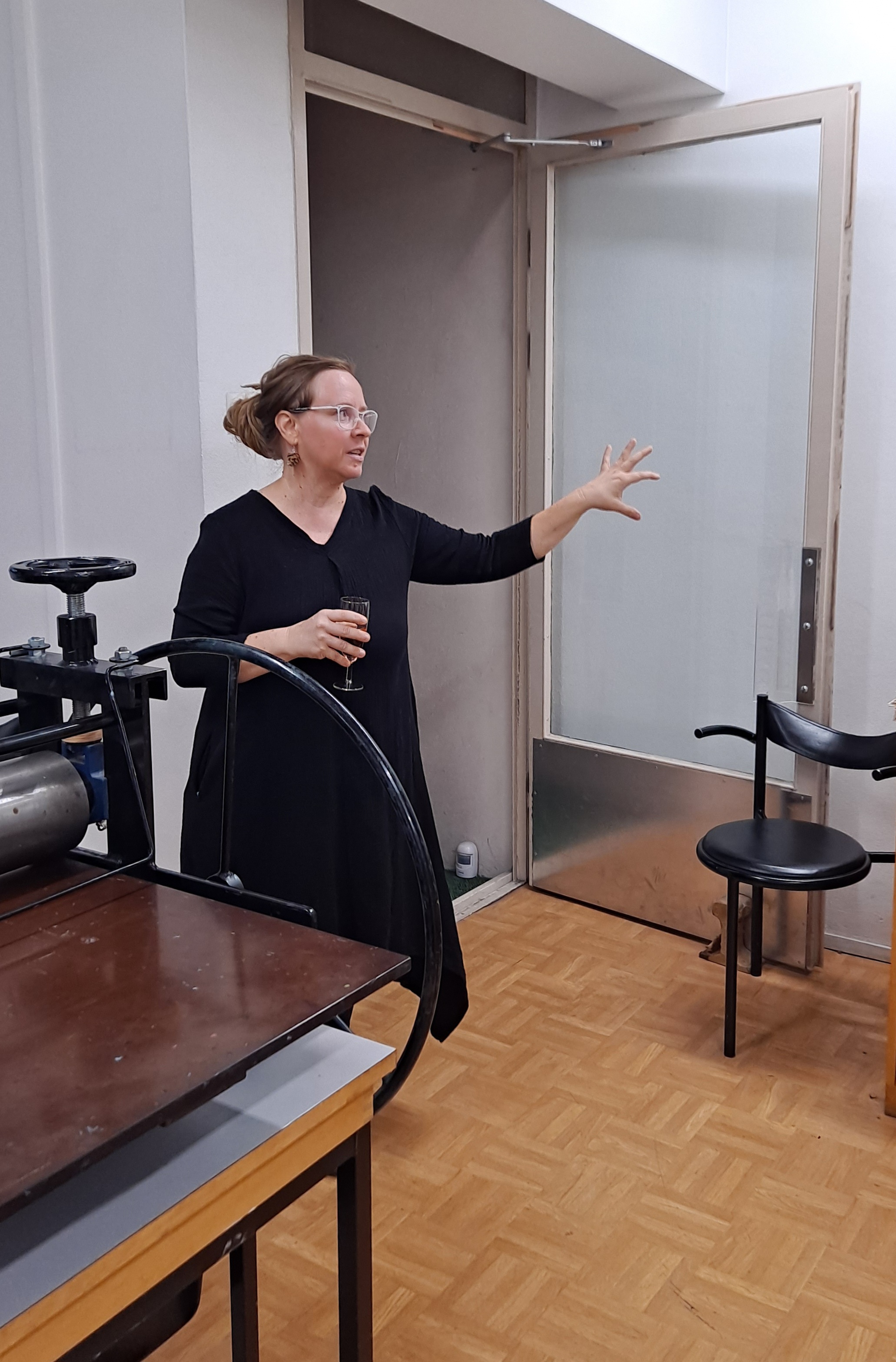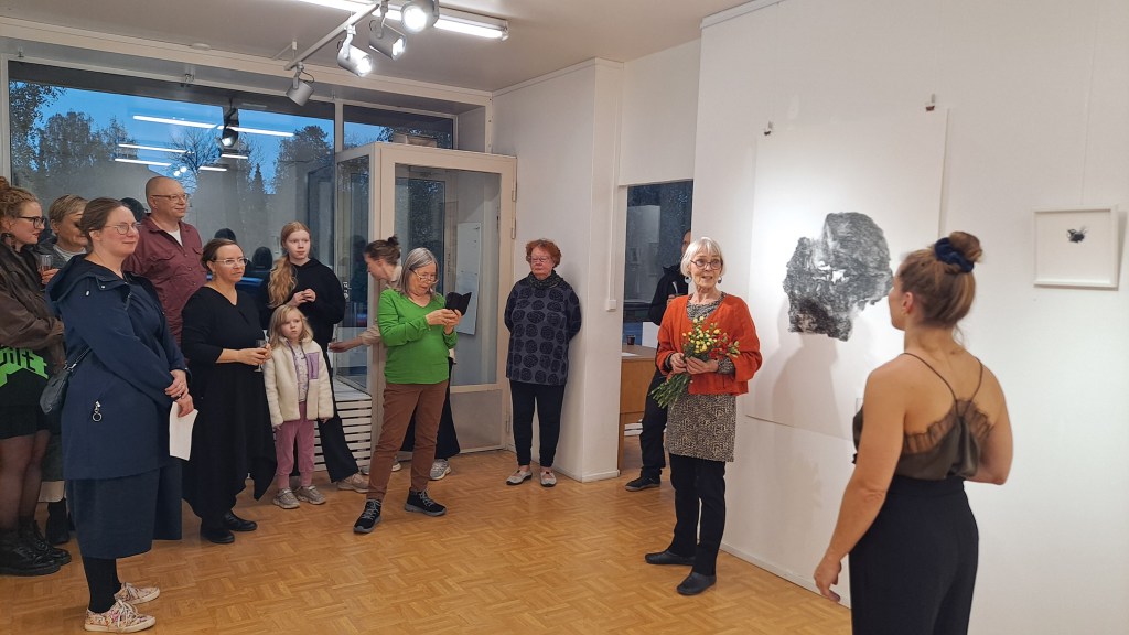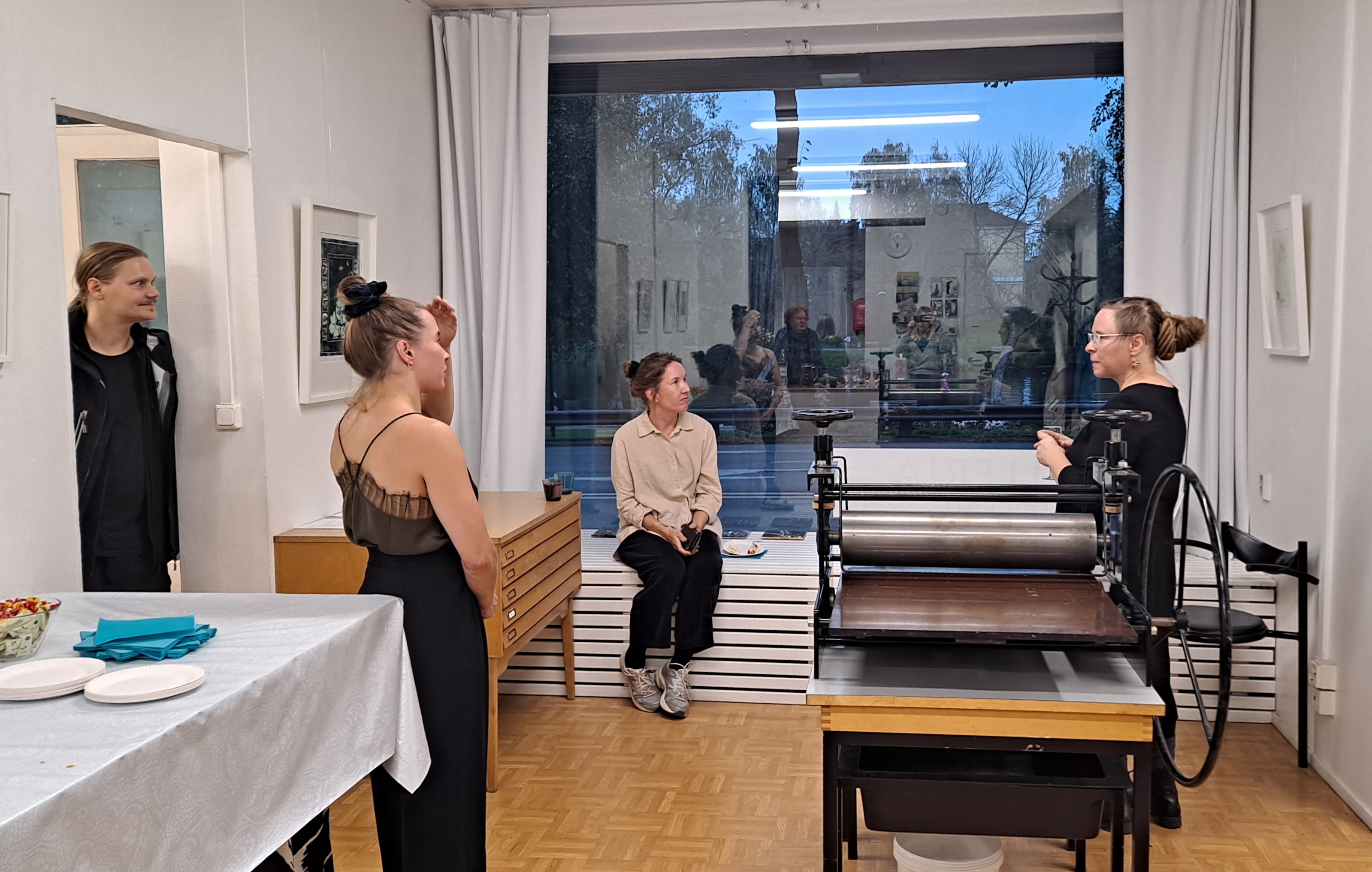 Elokuun alussa vietetyt avajaistet olivat lämminhenkiset ja mukavat, avajaisvieraat viihtyivät niin gallerian kuin myös grafiikanpajan puolella. Edwina esitteli teoksiaan ja kertoi omasta taidetyöskentelystään.