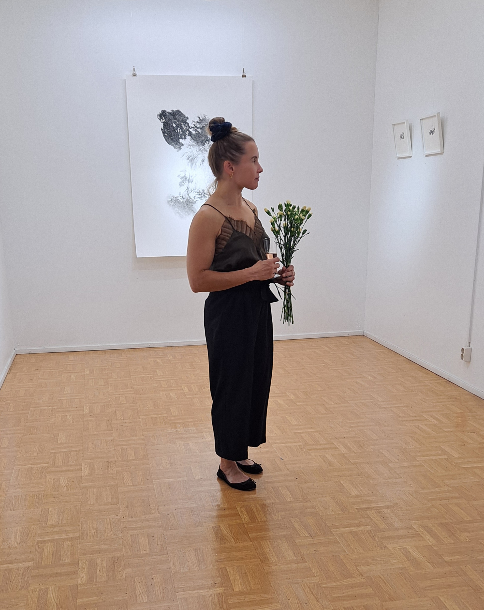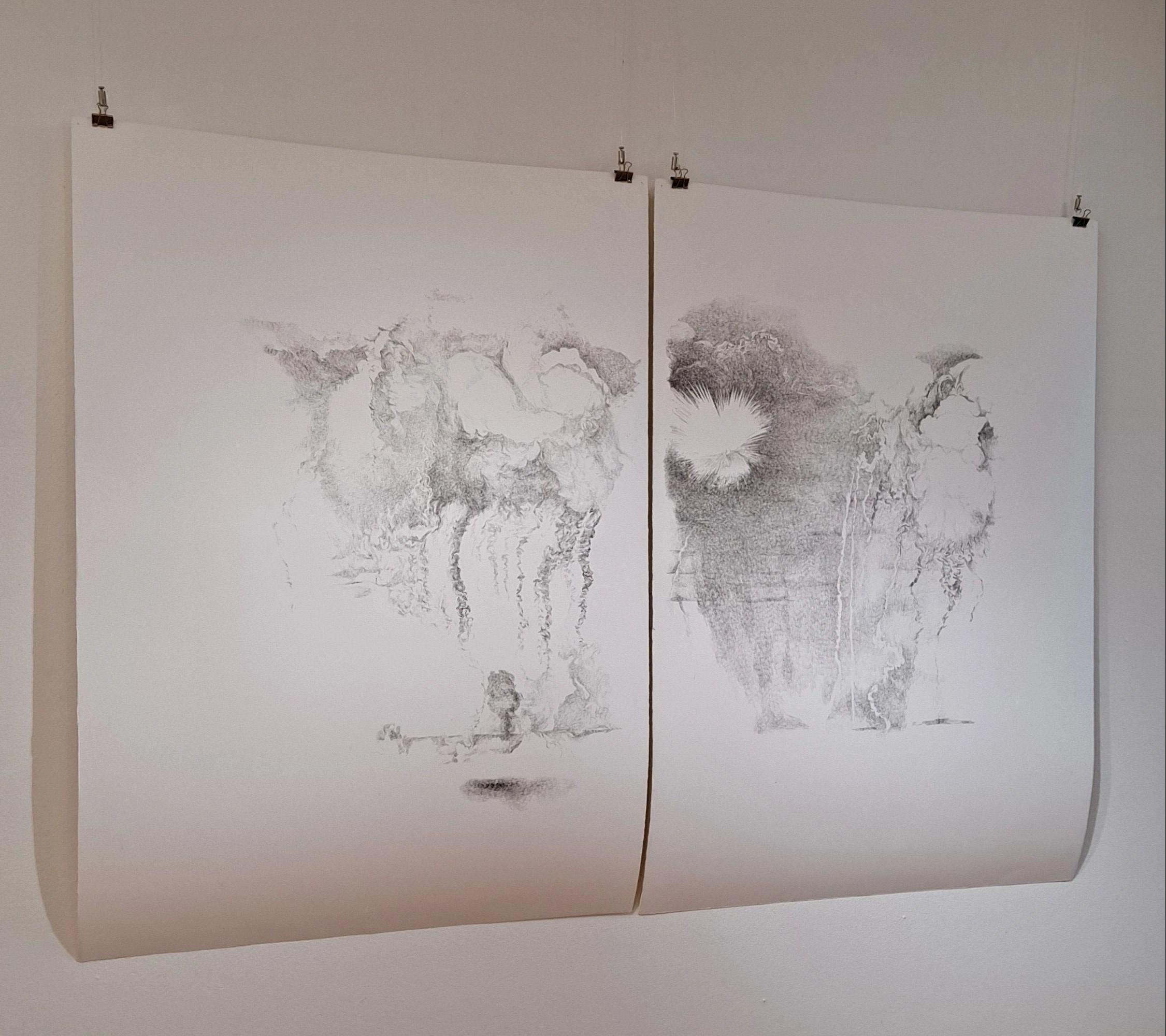 Veeran näyttelyssä esillä olevat teokset on piirretty tussilla paperille luonnostelematta. Mari Suson näyttely koostuu monotypia töistä.