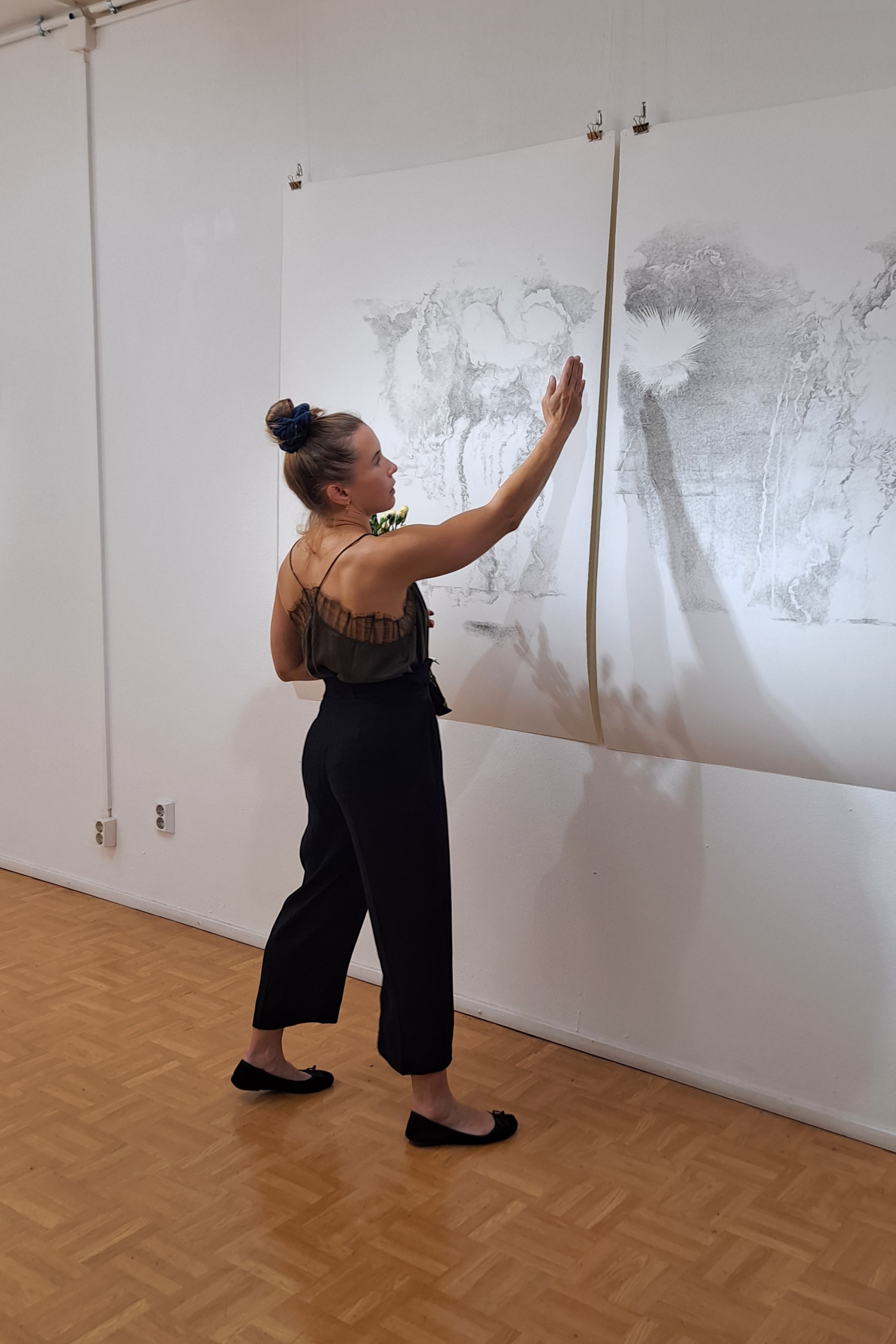 Taiteilija selitti myös, että hänen teokset käsittelevät aikaa ja sitä, minkälaiselta tilalta aika hänestä tuntuu. Piirroksissa on kuviteltuja luonnon paikkoja ja tiloja, jotka muodostuvat tunnistettavista elementeistä kuten vesimassoista, maasta, pilvipeitteestä. Näyttelykokonaisuuden piirrokset kuvaavat liikkuvien massojen hidasta muodonmuutosta ja niiden jälkeensä jättämää hiljaista tilaa.