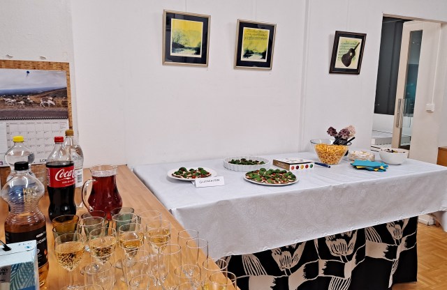 Avajaiset olivat tiistaina 31.10.2023. Grafiikanpajan puolen avajaistarjoilukattaus oli galleriatyöntekijä Julia Mattilan aikaansaannosta! Tarjoilut eivät ole avajaisten pääasia, mutta siitä huolimatta Paperihuoneen avajaistarjoilut pyritään tekemään näyttelyiden teemaan sopivaksi kokonaisuudeksi.
