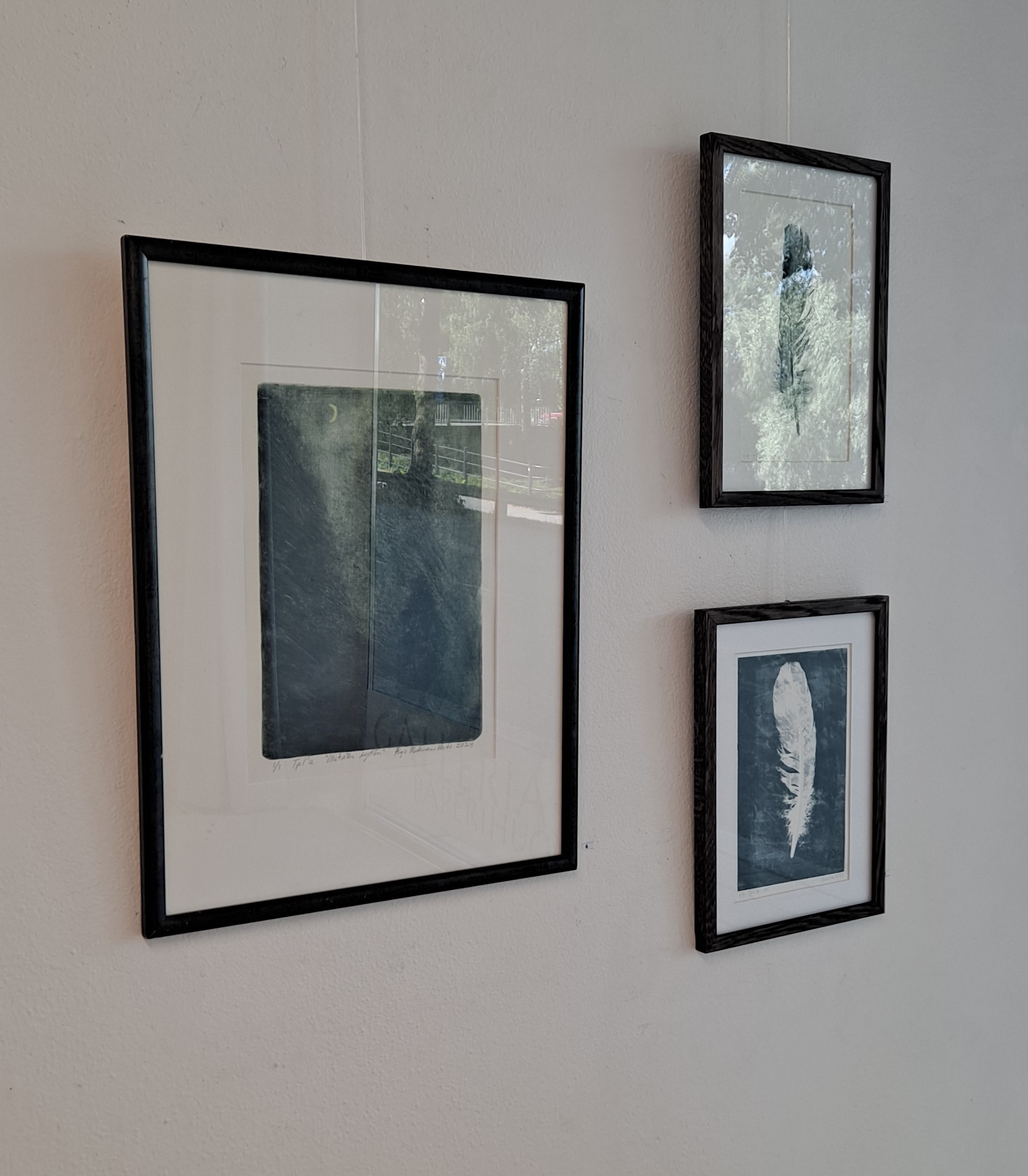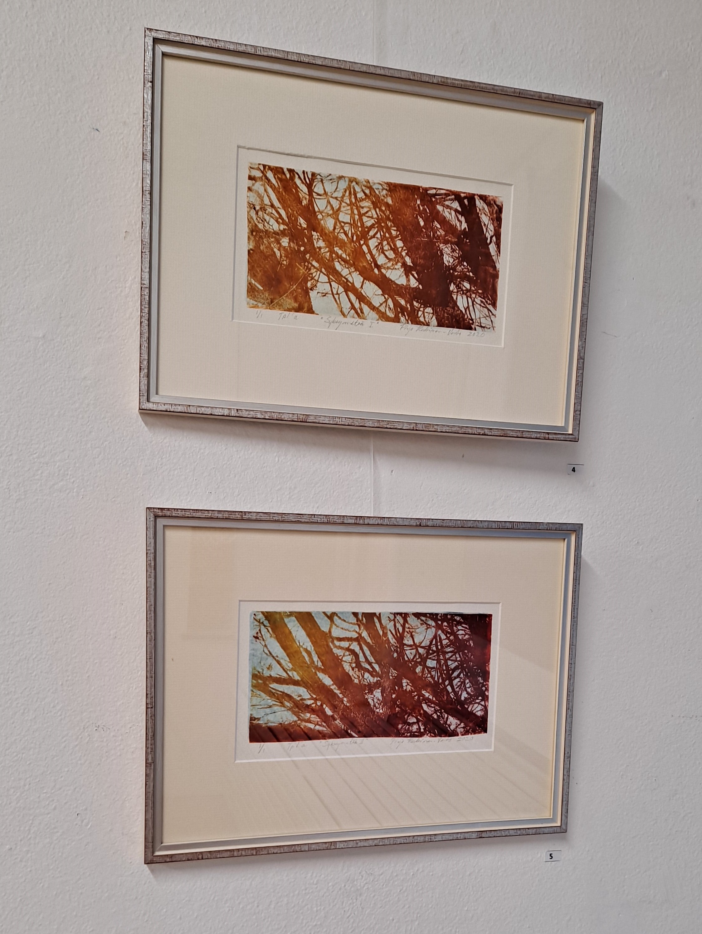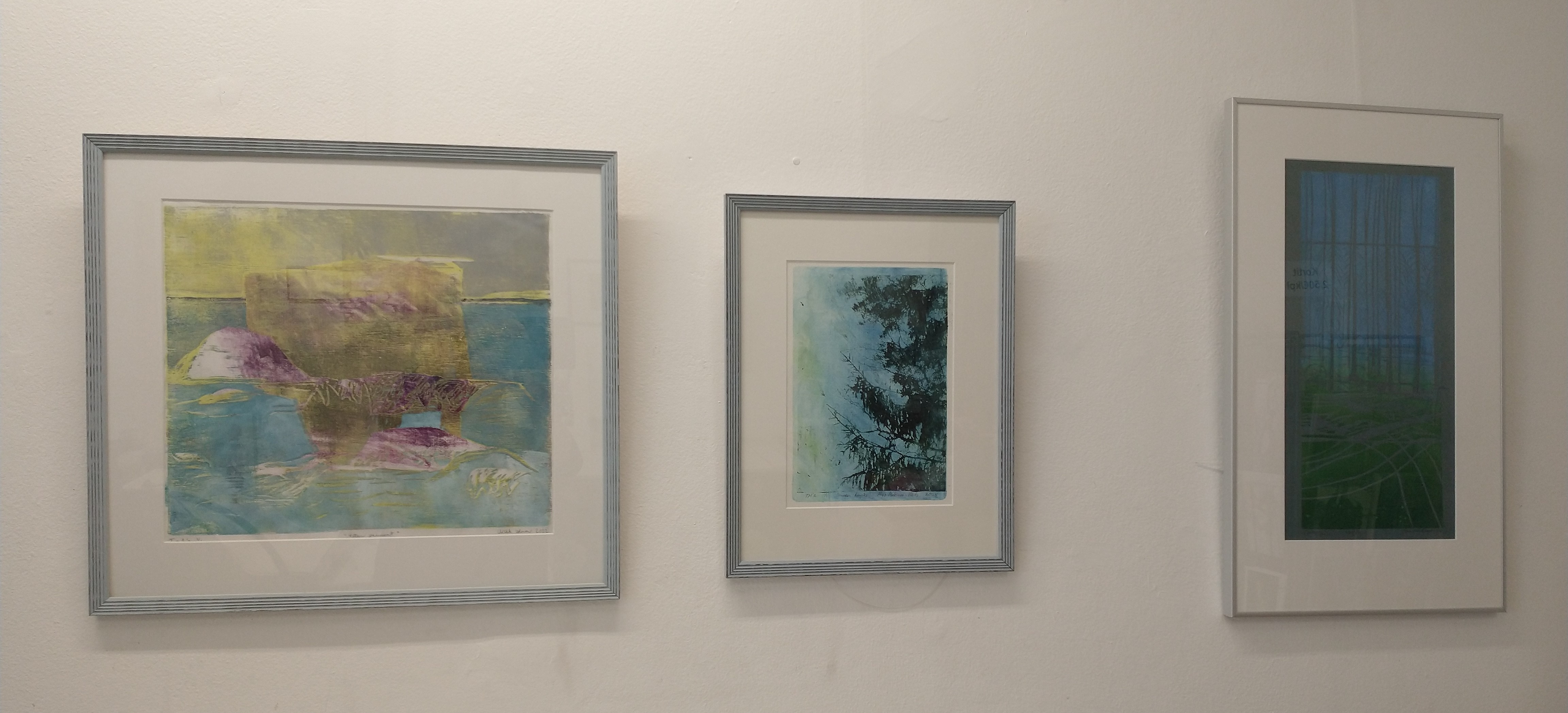 Pirjo Keskinen-Vennon Metsän sydän, 2024 monotypia. Ansku Lehtovaaran Varjo, 2022, monotypia ja Verho, 2022, monotypia.
