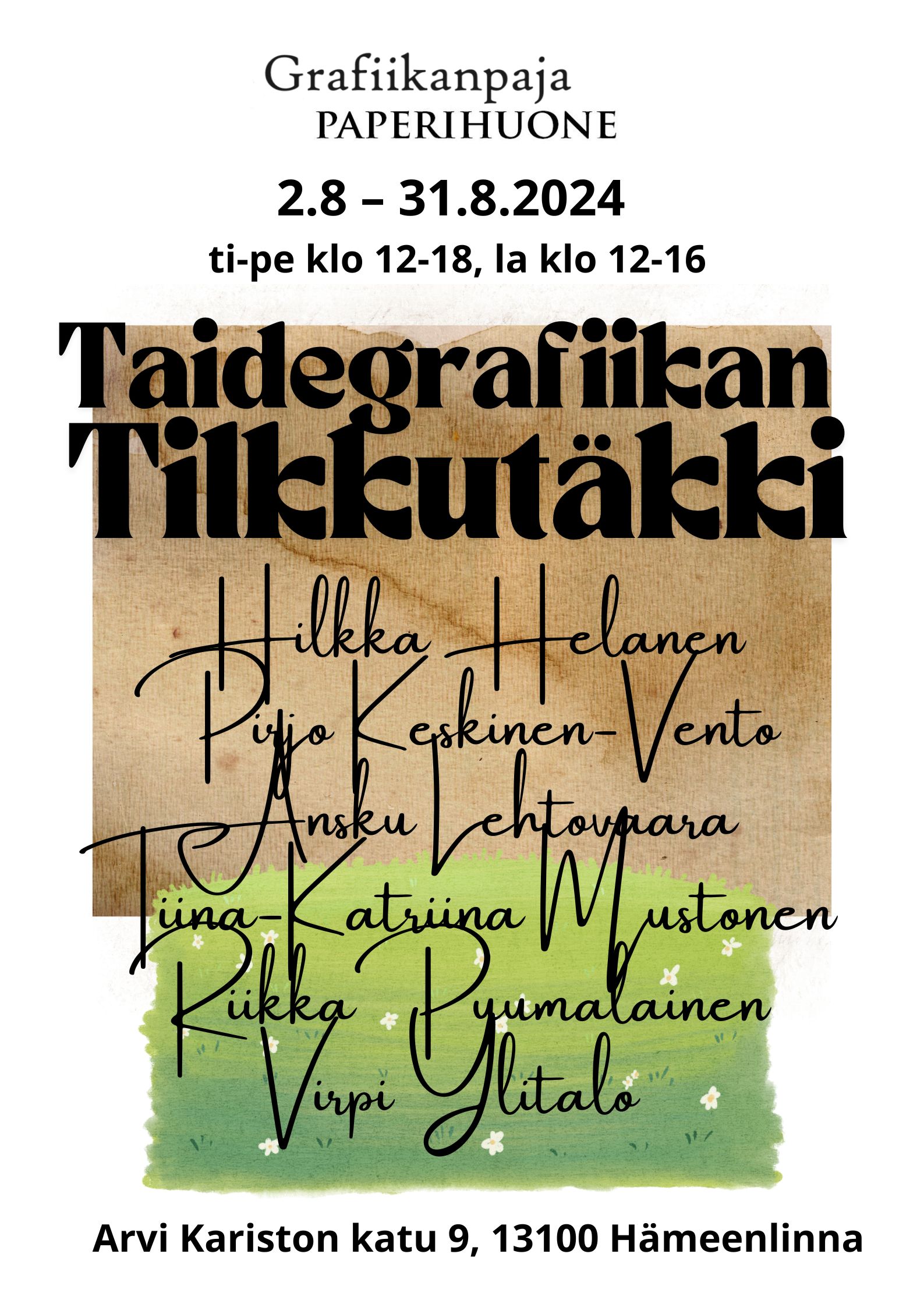 Grafiikanpajalla on Paperihuone ry:n hallituksen jäsenten Hilkka Helasen, Pirjo Keskinen-Vennon, Ansku Lehtovaaran, Tiina-Katriina Mustosen, Riikka Puumalaisen ja Virpi Ylitalon yhteisnäyttely, johon ripustetut teokset tuovat esiin grafiikan eri menetelmiä: etsaus&aktavinta, fotoetsaus, kopiografiikka, kuivaneula& carborundum, monotypia, syanotypia sekä puupiirros. Tästä myös näyttelyn nimi Taidegrafiikan Tilkkutäkki muodostui.