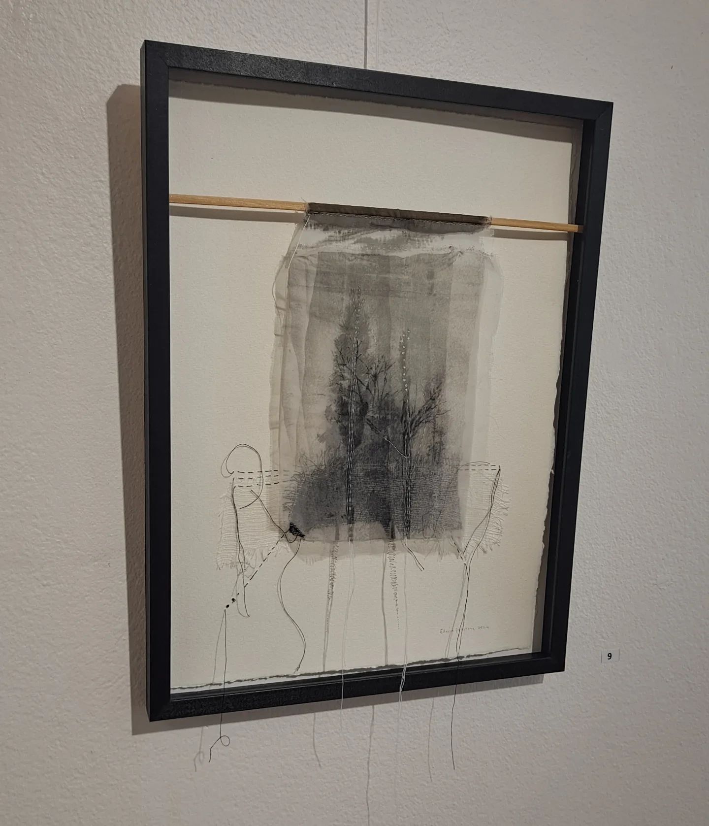 Kuvassa teos nro 1. Mentations I. 2024, sekatekniikka : textile, paper, pen, ink, charcoal, monoprint and embroidery.