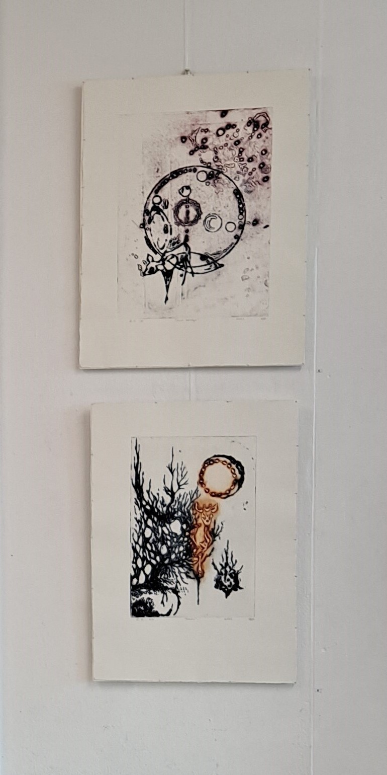 Riikka Puumalaisen Kuun kehräys, 2024, kuivaneula ja carborundum ja Hehku, 2024, kuivaneula ja carborundum.