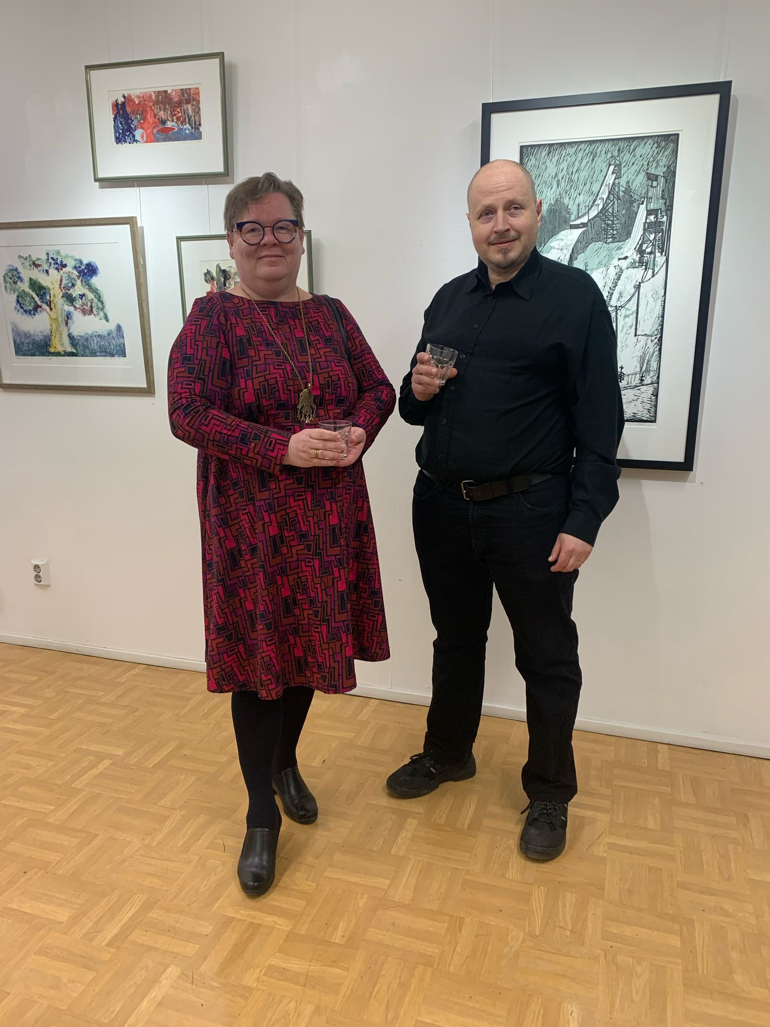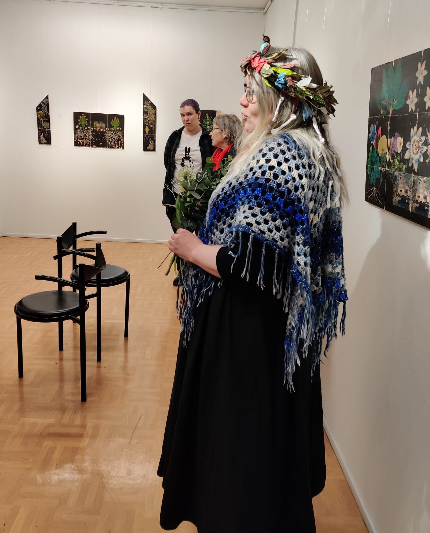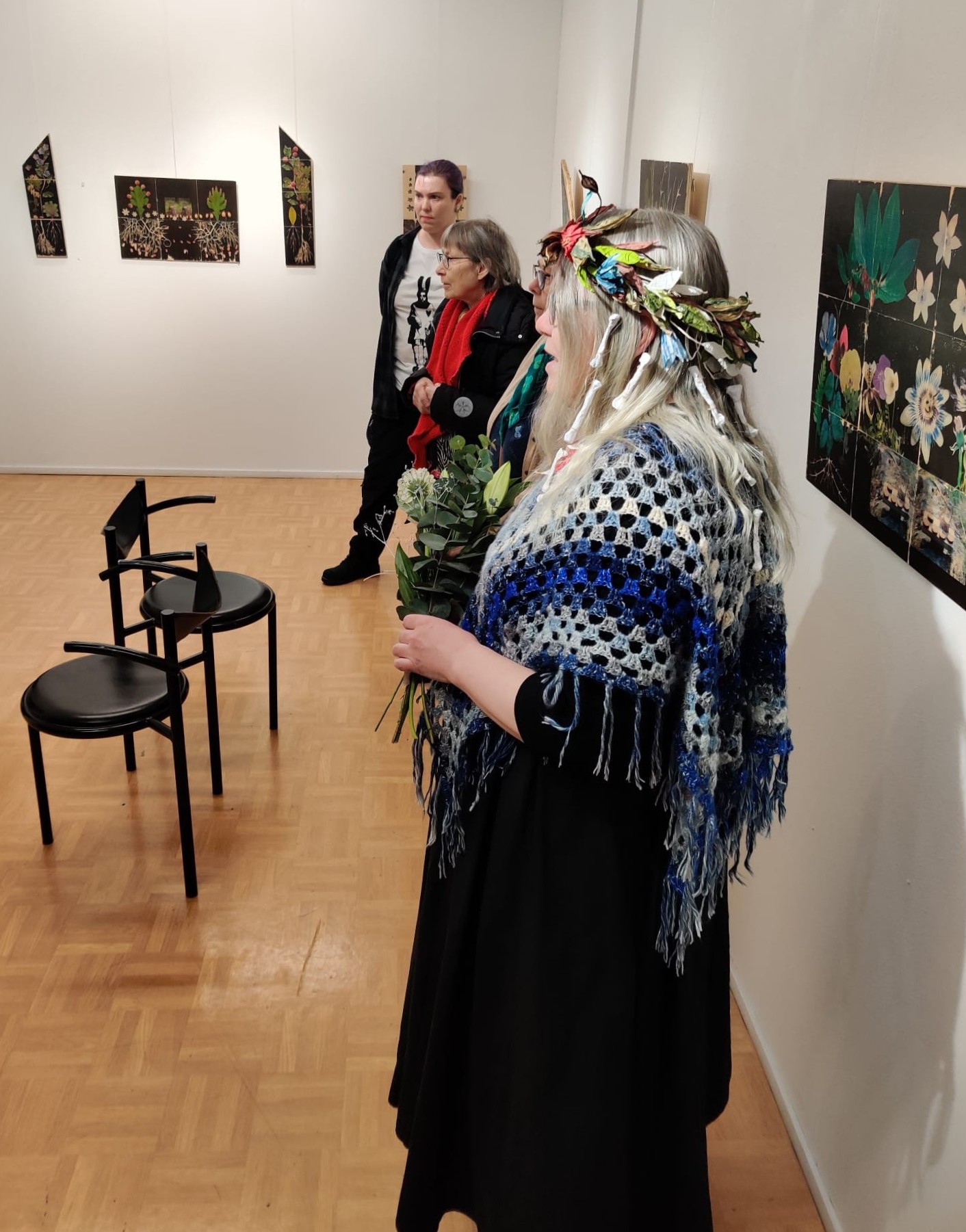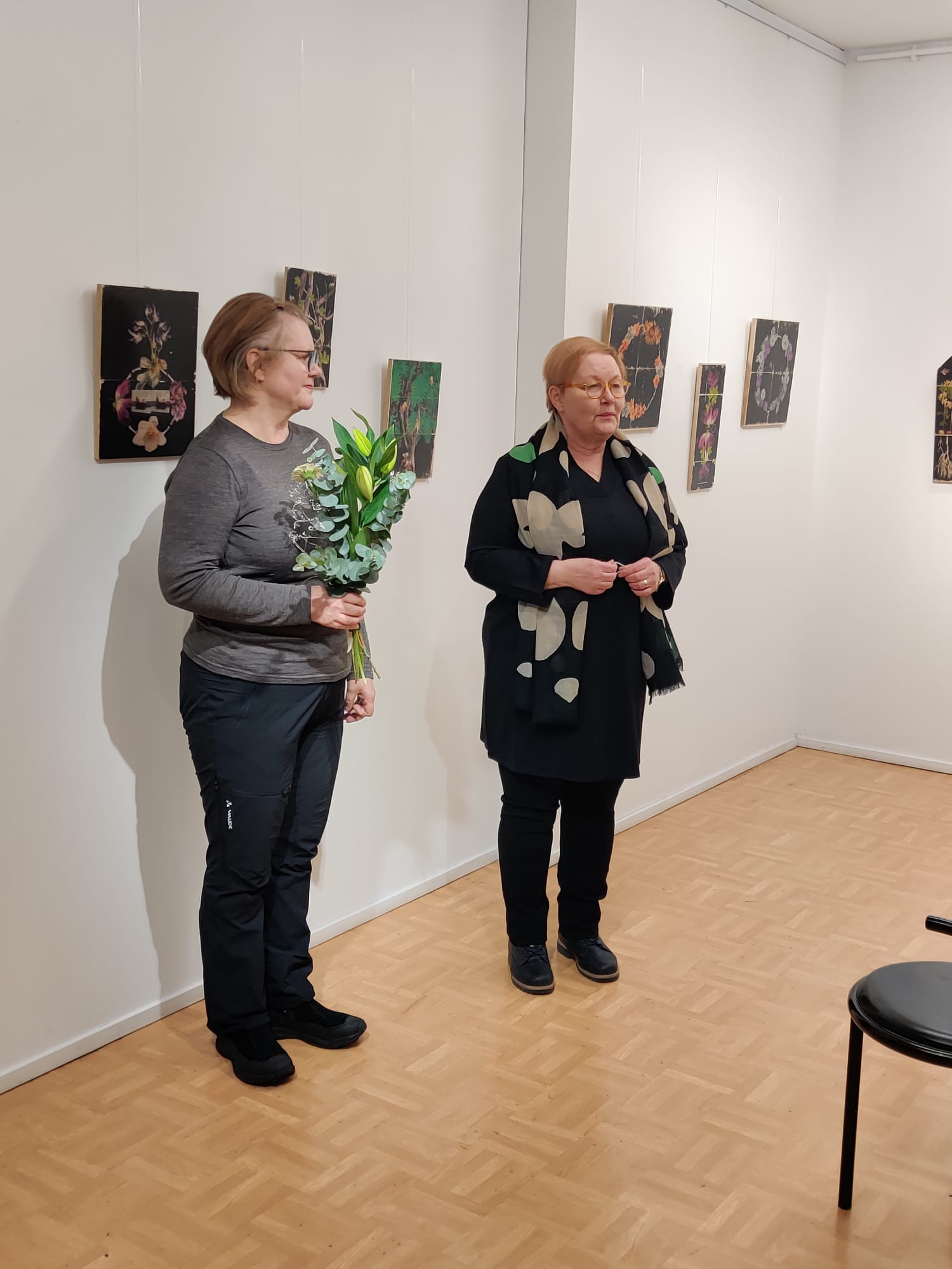 Paperihuone ry:n sihteeri Tiina-Katriina Mustonen toivotti taiteilijat ja avajaisvieraat tervetulleiksi. Molemmat taiteilijat saivat värikkäät onnittelukukat, jonka jälkeen puheenvuoro siirtyi heille.