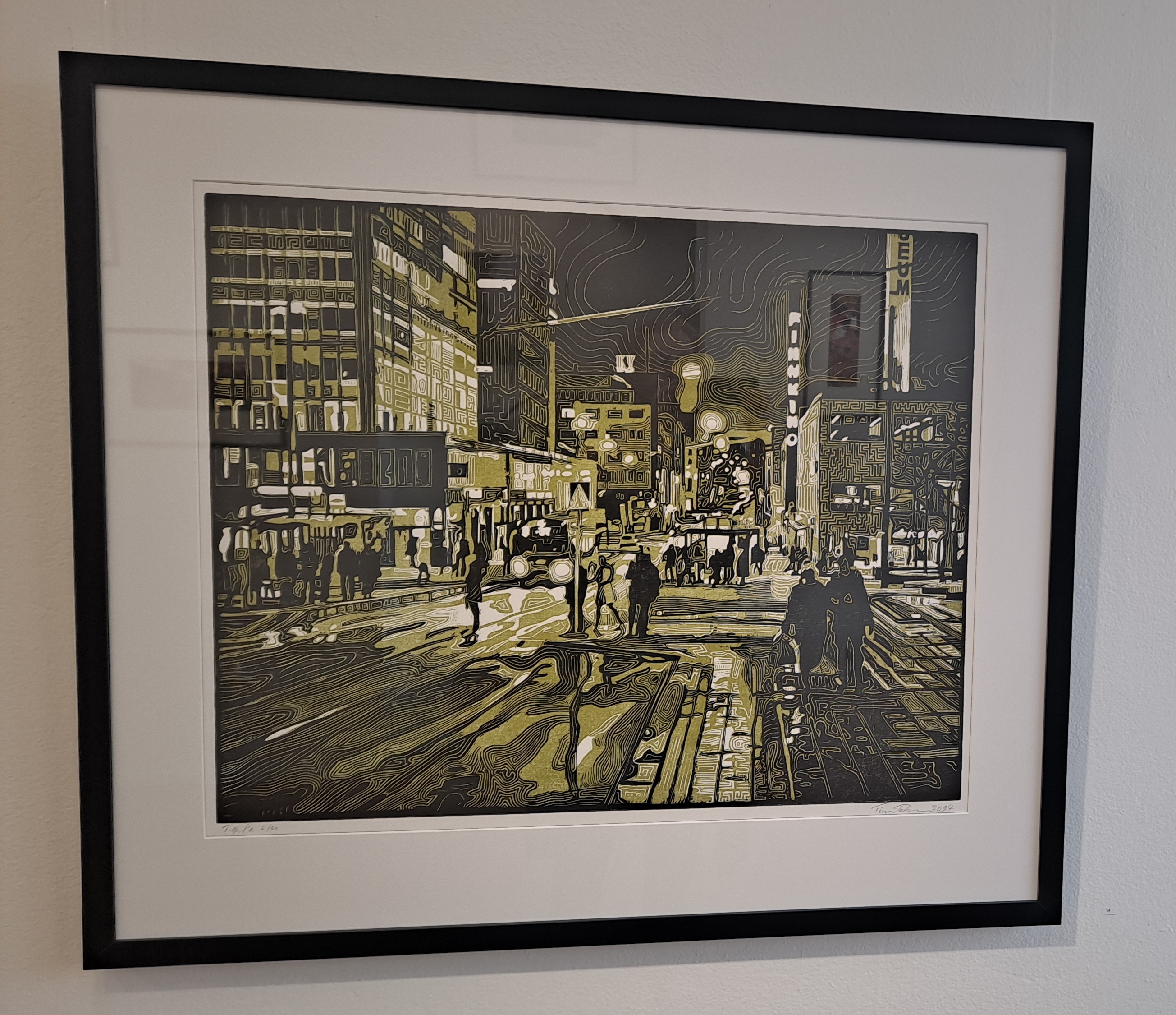 Timo Tolonen taas on syntynyt kaupungissa ja asuu nykyään maalla. Hän kuvaa puupiirroksissaan dokumentaarisesti kaupunkiaiheita mm. Helsingistä ja Tampereelta . Hänen grafiikassaan viivalla on vahva merkitys.