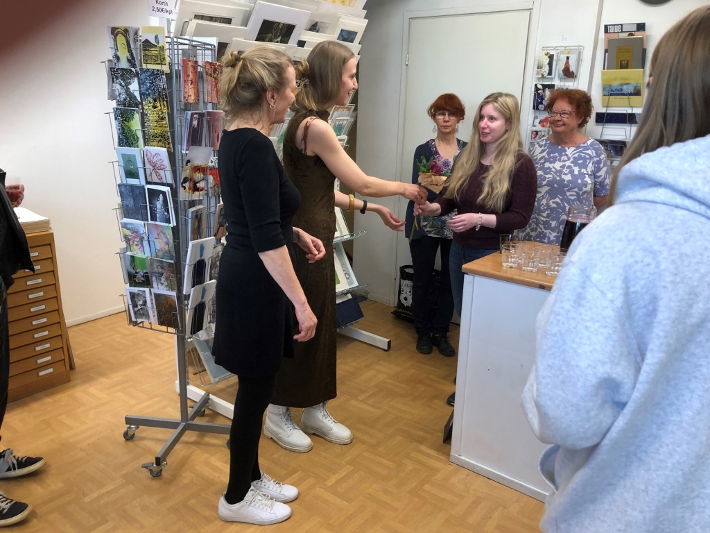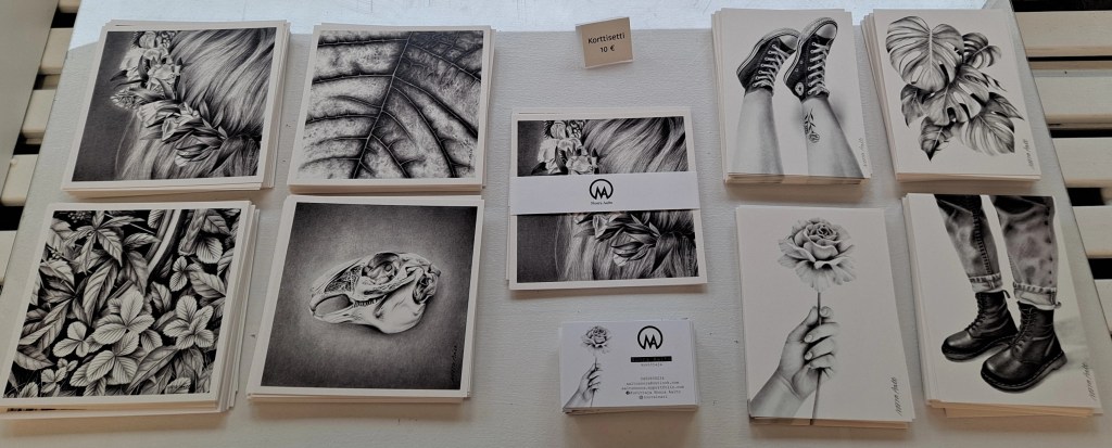 Nooran teoksista tehdyt kortit ovat myynnissä gallerialla näyttelyn ajan.