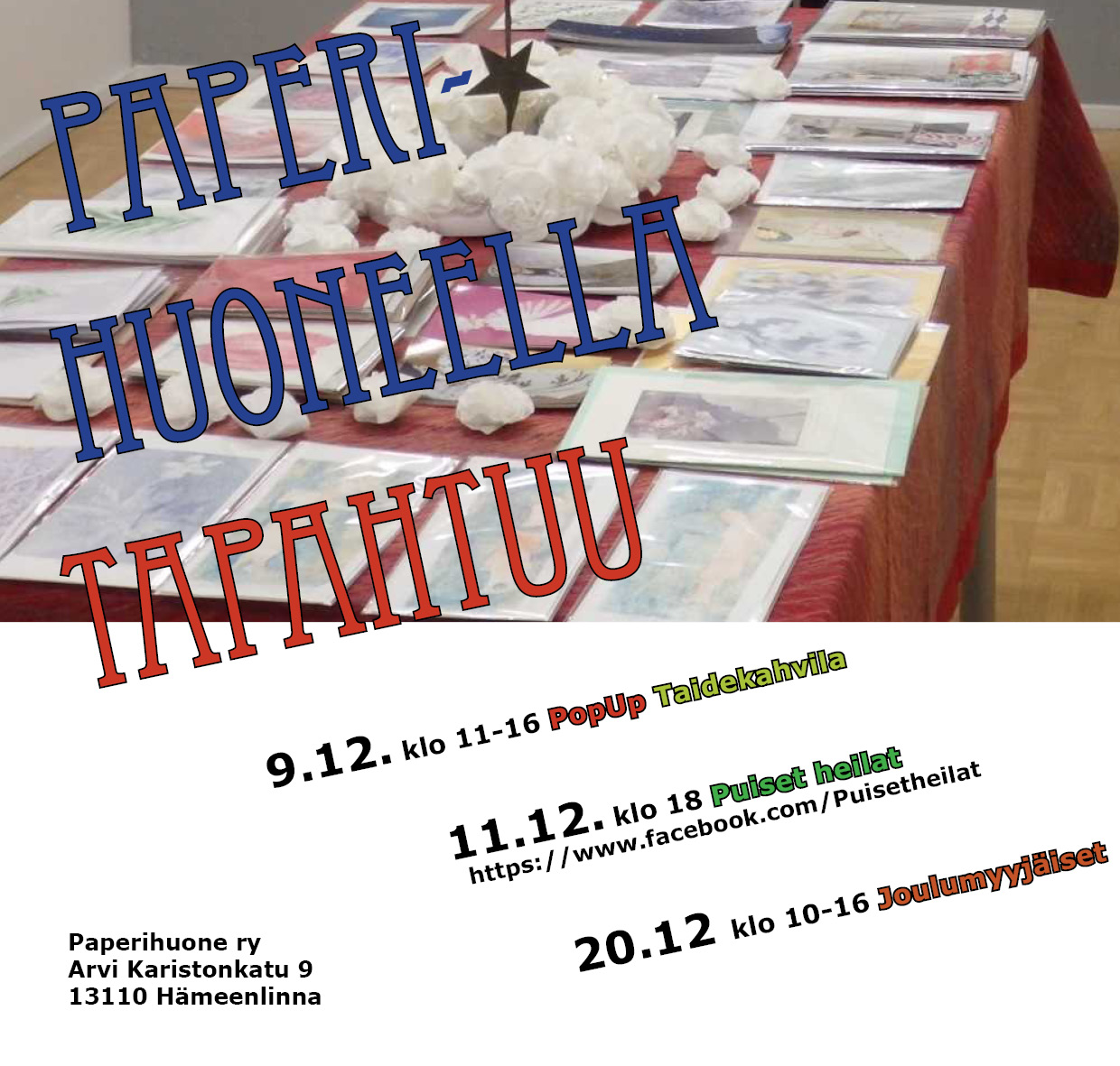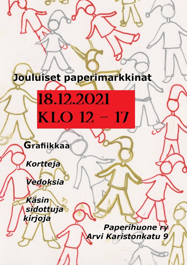 *Jouluiset paperimarkkinat. Tarjolla grafiikkaa, kortteja, vedoksia, käsin sidottuja kirjoja ja muuta jouluun sopivaa.