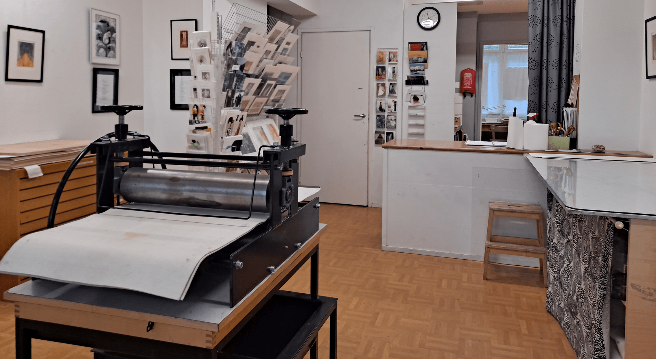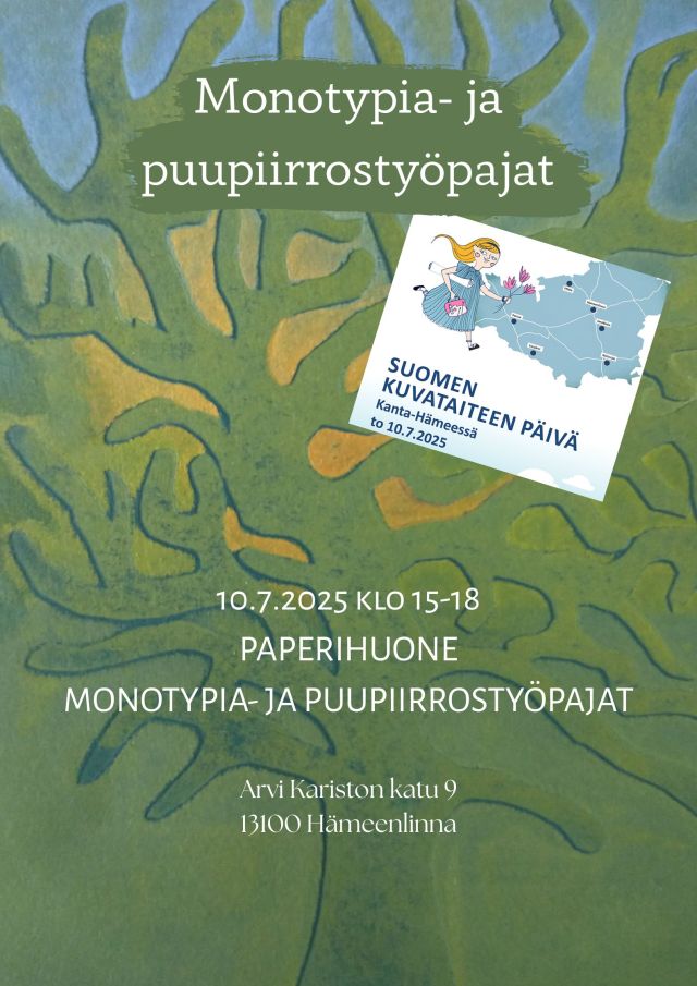 Työpajassa voi ohjatusti tehdä 1-2 monotypiavedosta klo 14-17 välisenä aikana. Monotypiatyöpajaan osallistuminen ei edellytä aikaisempaa kokemusta taidegrafiikan tekemisestä.