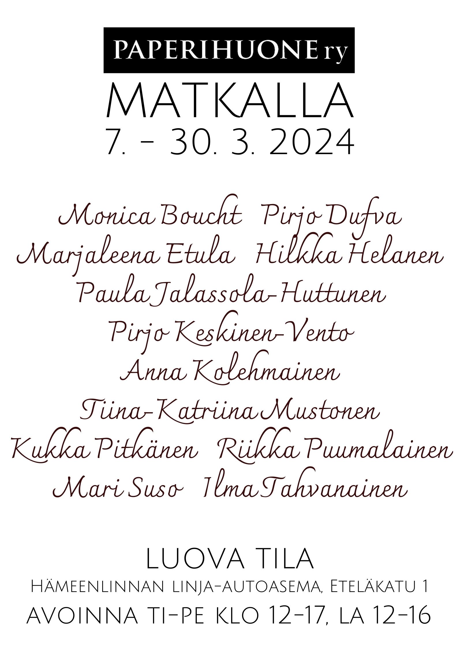 Taidegrafiikan yhdistys Paperihuone ry:llä on 7.3.-30.3.2024 Hämeenlinnan linja-autoaseman luovassa tilassa Matkalla – näyttely, joka koostuu yhdistyksen jäsentaiteilijoiden teoksista.